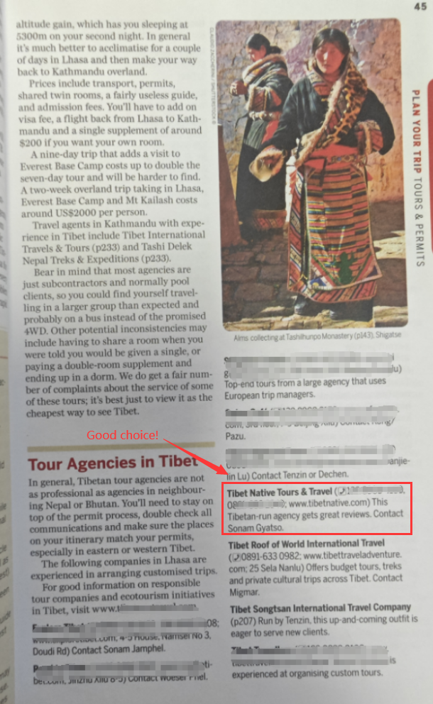 We are recommended on page 45 of the Lonely Planet travel guide (2019 edition) in the section introducing local Tibet travel agencies. This recognition highlights our reputation as a trustworthy Tibet-based travel agency. We specialize in providing professional Tibet travel services for international visitors, including compliant assistance with obtaining the Tibet Travel Permit required for foreign travelers.
